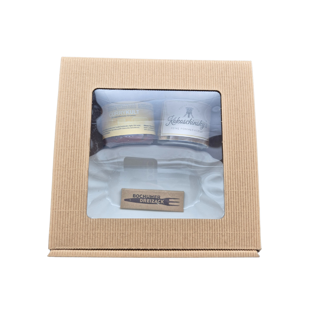 Als Stadt mir der besten Currywurst ein Pflichtpaket! Mit diesen Utensilien schmeckt unsere geliebte Currywurst am besten! Currysauce (200 ml), Pommesschale aus Porzellan, der Bochumer Dreizack aus Edelstahl und Kokoschinsky’s Pommes Gewürz in einem kleinen Karton mit Sichtfenster und unserer Postkarte „Unser Sushi“.